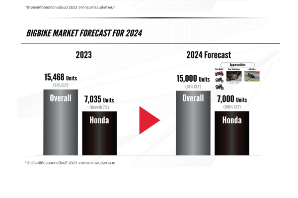 ในส่วนของตลาดรถบิ๊กไบค์ หรือรถจักรยานยนต์ขนาด 400cc ขึ้นไป ตลอดปี 2023 มียอดจดทะเบียนอยู่ที่ 15,468 คัน ลดลง 9% เมื่อเทียบกับปีก่อนหน้า ในขณะที่ฮอนด้ามีตัวเลขอยู่ที่ 7,035 คัน เติบโตขึ้น 7% มากกว่าตลาดรวม และในปี 2024 นี้ คาดว่าตลาดรวมจะอยู่ที่ระดับ 15,000 คัน ในขณะที่ฮอนด้าตั้งเป้ายอดจำหน่ายไว้ที่ 7,000 คัน