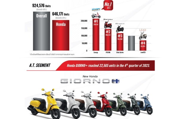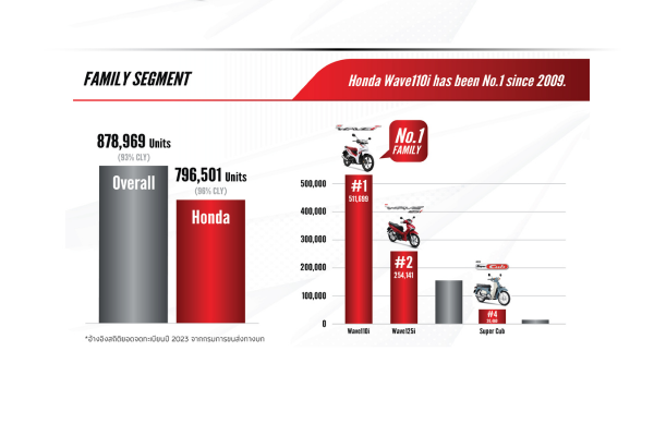 ไทยฮอนด้า ผู้ผลิตและจัดจำหน่ายรถจักรยานยนต์และเครื่องยนต์อเนกประสงค์ฮอนด้าในประเทศไทย เปิดเผยยอดจำหน่ายรถจักรยานยนต์ฮอนด้าปี 2023 ภาพรวมตลาดแตะระดับ 1.88 ล้านคัน ฮอนด้าคว้ายอดจดทะเบียนสูงสุดที่ 1.47 ล้านคัน ครองอันดับที่ 1 ติดต่อกันเป็นปีที่ 35 พร้อมคว้ายอดจดทะเบียนสูงสุด 5 อันดับแรก