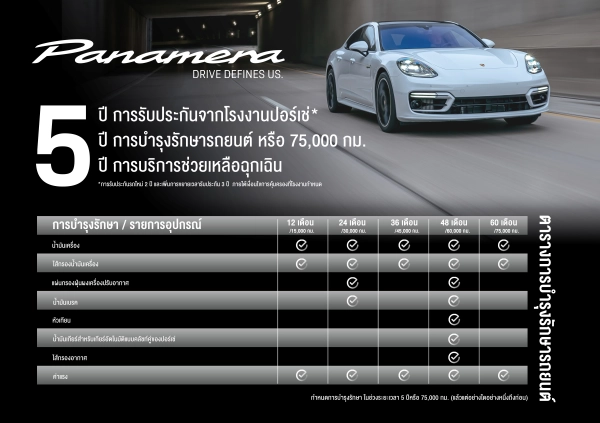 ซึ่งการบำรุงรักษารถยนต์แบบ 5 ปี เหมาะสำหรับผู้ที่ต้องการความอุ่นใจในการดูแลรักษารถยนต์ระยะยาว หรือแบบ 75,000 กม. ก็เหมาะสำหรับผู้ที่ใช้งานรถยนต์เป็นประจำเช่นกันการบริการช่วยเหลือฉุกเฉิน นาน 5 ปี เพราะเราเข้าใจดีว่าทุกการเดินทางมีความสำคัญเราพร้อมบริการช่วยเหลือฉุกเฉินตลอด 24 ชั่วโมง ยาวนาน 5 ปีเต็ม เพื่อให้ท่านอุ่นใจได้ตลอดการเดินทาง ไม่ว่าจะใกล้หรือไกลมั่นใจได้เลยว่าบริการช่วยเหลือฉุกเฉินครอบคลุมทุกสถานการณ์และปลอดภัยในทุกการเดินทางอย่าปล่อยให้โอกาสสุดพิเศษนี้หลุดลอยไป! รีบจับจองรถปอร์เช่ พานาเมร่า (G2 II) ที่พร้อมส่งมอบ และรับข้อเสนอ “ดูแลรถยนต์ตลอดระยะเวลา 5 ปี” ได้ตั้งแต่วันนี้ – 30 มิถุนายน 2567 เท่านั้น