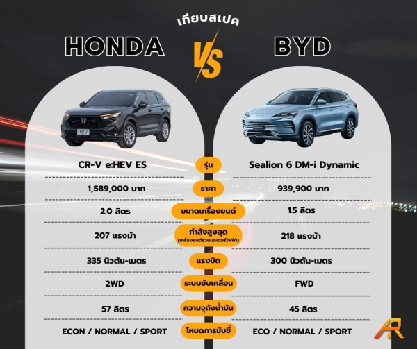 เปรียบเทียบสเปคระหว่าง Honda CR-V e:HEV ES 2WD ราคา 1,589,000 บาทเเละ BYD Sealion 6 DM-i Dynamic ราคา 939,900 บาท