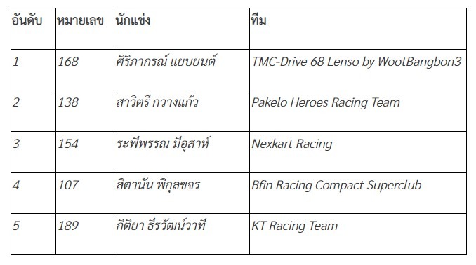 ผลการเเข่งขัน YARIS One Make Race: Division 1 (แข่งขัน 20 รอบ)