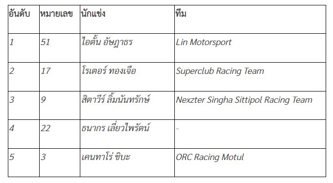 ผลการเเข่งขัน COROLLA ALTIS GR Sport One Make Race (แข่งขัน 20 รอบ)