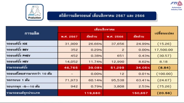 จำนวนการผลิตรถยนต์ทั้งหมดในเดือนสิงหาคม 2567 มีทั้งสิ้น 119,680 คัน ลดลงจากเดือนสิงหาคม 2566 ร้อยละ 20.56 เพราะผลิตเพื่ อขายในประเทศและผลิตเพื่อส่ งออกลดลงร้อยละ 40.49 และ 6.62 ตามลำดับจากการผลิตรถกระบะลดลง และลดลงจากเดือนกรกฎาคม 2567 ร้อยละ 4.12