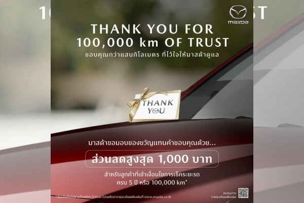 มาสด้า เซลส์ ประเทศไทย ส่งแคมเปญพิเศษ “THANK YOU FOR 100,000 km OF TRUST ขอบคุณกว่าแสนกิโลเมตรที่ไว้ใจให้มาสด้าดูแล” มอบคูปองส่วนลดสูงสุด 1,000 บาท ให้กับลูกค้ามาสด้าแฟมิลี่ เพื่อแทนคำขอบคุณที่ไว้ใจเข้าเช็กระยะกับศูนย์บริการตลอด 5 ปี หรือ 100,000 กม. ตอกย้ำถึงคำมั่นสัญญาจากมาสด้าที่ต้องการดูแลลูกค้าและรถยนต์ของลูกค้าไปตลอดอายุการใช้งาน  สำหรับลูกค้าที่ได้สิทธิ์จะได้รับ SMS แจ้งทางมือถือที่ลงทะเบียนไว้กับศูนย์บริการ