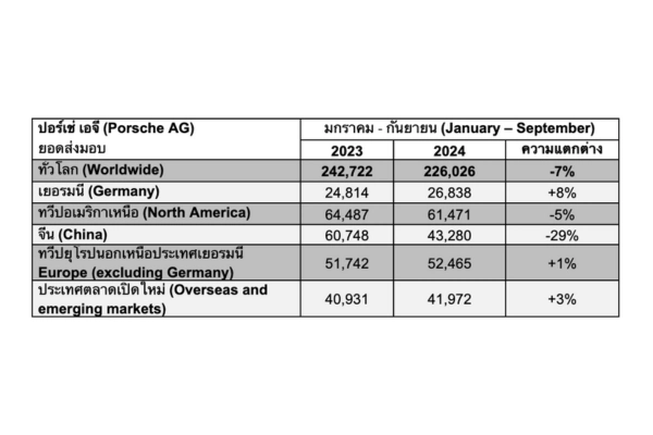 ในช่วง 9 เดือนแรกของปี ปอร์เช่ยังคงทำตามเป้าหมายที่วางไว้ การส่งมอบในปีที่มีการเปิดตัวผลิตภัณฑ์ใหม่ยังคงอยู่ในระดับที่มั่นคง และโครงสร้างการจัดจำหน่ายในแต่ละภูมิภาคยังคงสมดุล คาเยนน์ (Cayenne) มีการเติบโตอย่างแข็งแกร่ง ขณะที่รถสปอร์ต 2 ประตูยังมีอัตราการจำหน่ายสูงกว่าปีที่ผ่านมา โดยรวมแล้วมีการส่งมอบรถยนต์จำนวน 226,026 คันให้กับลูกค้าทั่วโลกระหว่างเดือนมกราคมถึงกันยายน ซึ่งลดลงเพียง 7% เมื่อเปรียบเทียบกับปีที่แล้ว สาเหตุหลักมาจากความพร้อมของผลิตภัณฑ์ที่จำกัด ขณะนี้ พานาเมร่า (Panamera), มาคันน์ (Macan),ไทคานน์ (Taycan) และ 911 คือ 4 โมเดลในทั้งหมด 6 โมเดลของปอร์เช่ ที่อยู่ในช่วงการพัฒนาเพื่อเปลี่ยนผ่านเป็นโมเดลใหม่