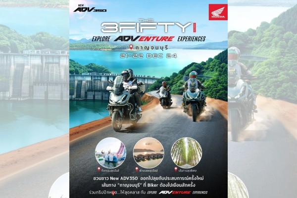 สำหรับกิจกรรม ‘The 3Fifty Journey’ ส่งท้ายปีครั้งนี้ ผู้เข้าร่วมกิจกรรมจะได้ทดสอบสมรรถนะของ Honda ADV350 อย่างเต็มที่ บนเส้นทางกรุงเทพฯ – กาญจนบุรี ที่ทุกคนจะได้สัมผัสประสบการณ์การขับขี่สุดพิเศษบนเส้นทางธรรมชาติที่สวยงาม สนุกสนานไปกับการพิชิตมิชชันระหว่างทางที่เต็มไปด้วยความเร้าใจ ก่อนปิดท้ายด้วยการผ่อนคลาย ชมพระอาทิตย์ตกดิน พร้อมรับประทานอาหารมื้อเย็นบนแพริมน้ำ