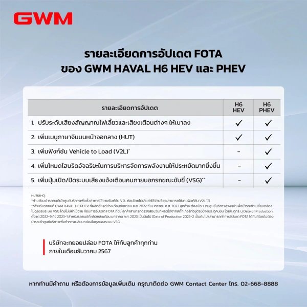 ส่วนรถ HAVAL H6 บริษัทจะทยอยปล่อย FOTA ให้กับลูกค้าทุกท่านภายในเดือนธันวาคม 2567 โดยท่านจะได้รับข้อความแจ้งเตือนที่หน้าจอกลางของรถท่าน เพื่อให้กดอัปเดตซอฟต์แวร์ตามขั้นตอนที่แนะนำ