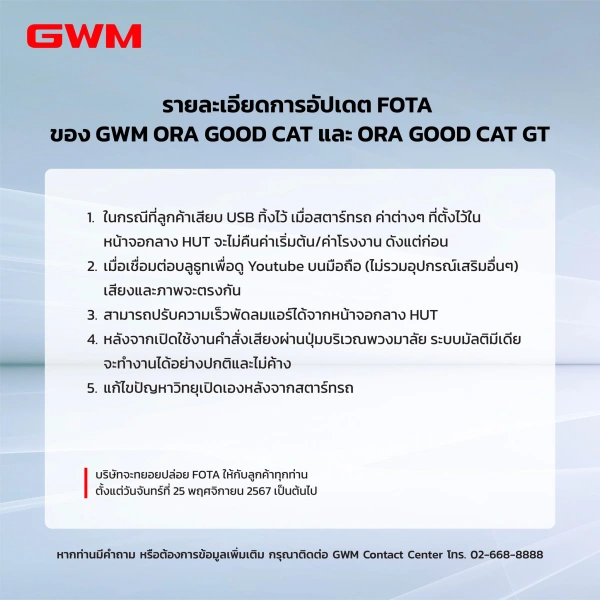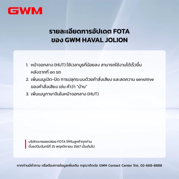 สำหรับรถ ORA GOOD CAT และ HAVAL JOLION บริษัทฯ จะทยอยปล่อย FOTA ให้กับลูกค้าทุกท่านตั้งแต่วันจันทร์ที่ 25 พฤศจิกายน 2567 เป็นต้นไป