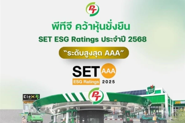 บริษัท พีทีจี เอ็นเนอยี จำกัด (มหาชน) หรือ PTG ได้รับผลการประเมินความยั่งยืน SET ESG Ratings ประจำปี 2568 ในระดับสูงสุด “AAA” จากตลาดหลักทรัพย์แห่งประเทศไทย สะท้อนถึงการดำเนินธุรกิจที่บูรณาการมิติด้านสิ่งแวดล้อม สังคม และบรรษัทภิบาล (ESG) เข้ากับกลยุทธ์และการดำเนินงานขององค์กรอย่างเป็นรูปธรรม